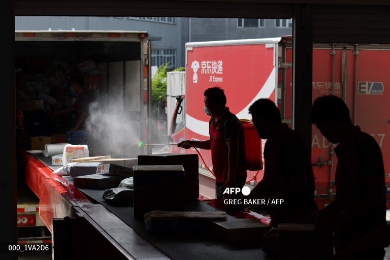 Nhân viên khử trùng bưu phẩm tại một kho hàng tại Trung Quốc (Ảnh: AFP)