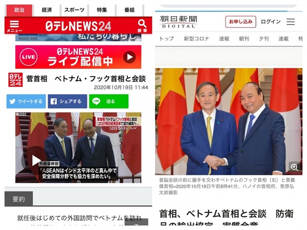 Hãng truyền hình Nhật Bản (Nihon TV) đã đăng tin nổi bật về việc hai nước thống nhất được việc nới lỏng đi lại giữa hai nước. Đồng thời, phân tích kỹ việc Thủ tướng Suga Yoshihide đã đề cập tới việc thực hiện lược Ấn Độ Dương-Thái Bình Dương và sự tham gia của ASEAN sẽ góp phần vào hòa bình ổn định của khu vực.