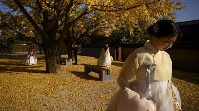 Người dân Hàn Quốc mặc Hanbok truyền thống thăm cung điện Gyeongbokgung ở thủ đô Seoul. Ảnh: AFP