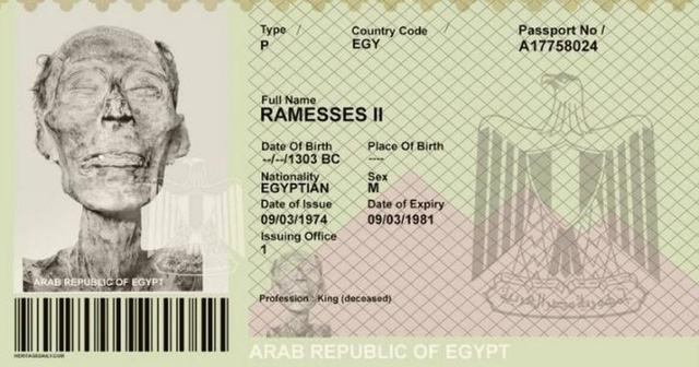 Trên tấm hộ chiếu đặc biệt này có ghi tên đầy đủ của Vua Ramesses II, năm sinh 1.303 trước Công Nguyên, ngày cấp hộ chiếu 9.3.1974 và ngày hết hạn 9.3.1981.