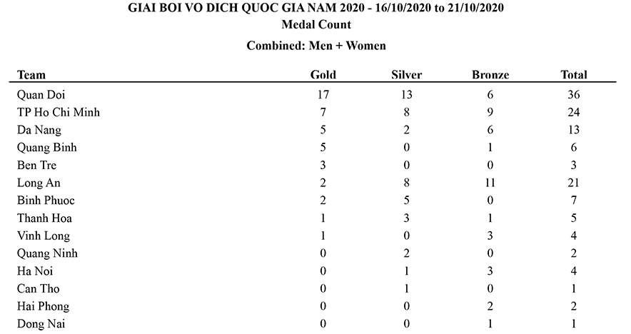 Xếp hạng toàn đoàn Giải bơi VĐQG 2020