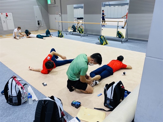 Sáng ngày 20.7, đội tuyển Thể dục dụng cụ đã bước vào buổi tập luyện đầu tiên tại nhà thi đấu của môn Thể dục. Dù buổi tập kéo dài qua trưa nhưng cả 2 VĐV Đinh Phương Thành và Lê Thanh Tùng đều tích cực hoàn thành các bài xà đơn, xà kép, nhảy chống. Lãnh đội Nguyễn Kim Lan và HLV Trương Minh Sang luôn theo sát các VĐV kể từ khi đội đặt chân tới Nhật Bản.