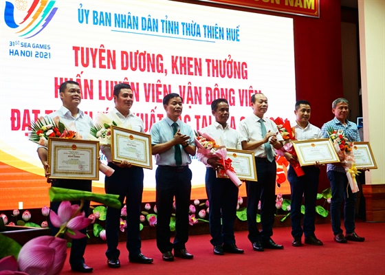 Dịp này, Chủ tịch UBND tỉnh cũng trao bằng khen và tặng thưởng cho tập thể Ban huấn luyện đội bóng đá hạng nhất (Đoàn bóng đá Thừa Thiên Huế) và 4 HLV (của bộ môn vật, bắn cung, judo) đã có thành tích huấn luyện, đào tạo những VĐV đạt thành tích cao tại SEA Games 31 vừa qua. Mức thưởng của các HLV trực tiếp đào tạo VĐV bằng 50% mức thưởng giành cho VĐV.