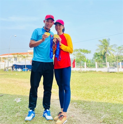 Vợ chồng VĐV Đinh Thị Hảo hạnh phúc với tấm HCV SEA Games
