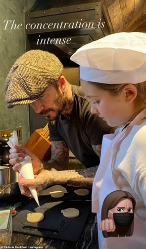Trước đó, Victoria Beckham cũng đăng tải hình ảnh con gái cưng Harper mặc nguyên đồng phục học sinh, đang tự tay chuẩn bị bữa sáng cho bố mẹ. Cô bé bện tóc hai bên và nở nụ cười rạng rỡ, xinh đẹp.