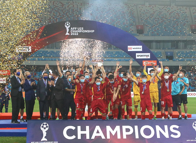 | Đầu tư phát bài bản, chuyên nghiệp để có thể khẳng định vị thế ở những sân chơi lớn hơn Ngay sau khi các cầu thủ Đội tuyển U23 Việt Nam giành chiến thắng 1-0 ở trận chung kết trước đội tuyển U23 Thái Lan để lần đầu tiên đăng quang chức vô địch Giải Bóng đá U23 Đông Nam Á 2022, Chủ tịch nước Nguyễn Xuân Phúc đã gửi lời chúc mừng với tình cảm nồng ấm nhất; đồng thời biểu dương, khen ngợi các cầu thủ, Huấn luyện viên Đinh Thế Nam và Ban huấn luyện. Chủ tịch nước chia sẻ với đội tuyển về những khó khăn do có nhiều cầu thủ bị mắc Covid-19, với đội hình hầu hết là những thành viên mới, song, các cầu thủ đã thể hiện bản lĩnh và ý chí Việt Nam, thi đấu kiên cường, quả cảm, đúng với tinh thần của những "Chiến binh Sao vàng", xứng đáng dành ngôi vô địch Giải Bóng đá U23 Đông Nam Á 2022. Chủ tịch nước Nguyễn Xuân Phúc đề nghị Liên đoàn Bóng đá Việt Nam có các phần thưởng xứng đáng dành cho đội tuyển và Ban huấn luyện; tiếp tục chăm lo, đầu tư phát triển bóng đá trẻ bài bản, chuyên nghiệp để bóng đá Việt Nam có thể khẳng định vị thế ở những sân chơi lớn hơn, vươn tầm châu lục; qua đó chuẩn bị tốt nhất cho vòng loại Giải vô địch Bóng đá Thế giới (World Cup) 2026. Cùng ngày, Thủ tướng Chính phủ Phạm Minh Chính đã gửi lời chúc mừng và biểu dương toàn thể đội tuyển U23 Việt Nam và Ban huấn luyện. Thủ tướng nhấn mạnh, tại giải vô địch bóng đá Đông Nam Á năm 2022, Đội tuyển U23 Việt Nam đã phải đương đầu với vô vàn khó khăn do ảnh hưởng bởi dịch Covid-19. Nhưng với bản lĩnh, ý chí, tinh thần quả cảm, tinh thần của người Việt Nam, tinh thần của những "chiến binh sao vàng", Ban huấn luyện và các cầu thủ của đội tuyển U23 Việt Nam đã vượt qua những khó khăn này để mang lại niềm vui, niềm tự hào cho Tổ quốc. Cùng với thành tích của đội tuyển bóng đá nữ và đội tuyển bóng đá nam quốc gia gần một tháng vừa qua, những chiến thắng của đội tuyển U23 Việt Nam mang thêm hy vọng cho bóng đá nước nhà trong năm mới và thời gian tới. P.V |