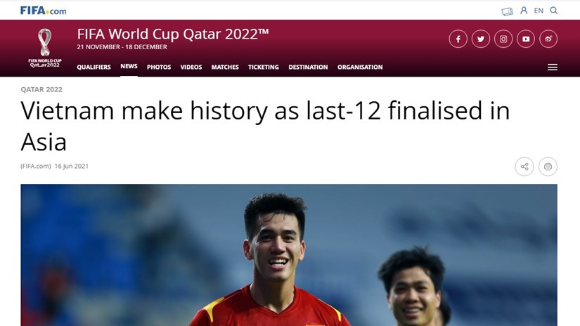 "Bước vào giai đoạn cuối của vòng loại thứ hai với tư cách đội đầu bảng, đội tuyển Việt Nam giành chiến thắng liên tiếp trước Indonesia và Malaysia để vươn lên trở thành một trong những đội nhì bảng xuất sắc nhất và chỉ thua sít sao đội chủ nhà UAE với tỷ số 2-3 ở trận đấu cuối cùng," trang chủ FIFA viết.