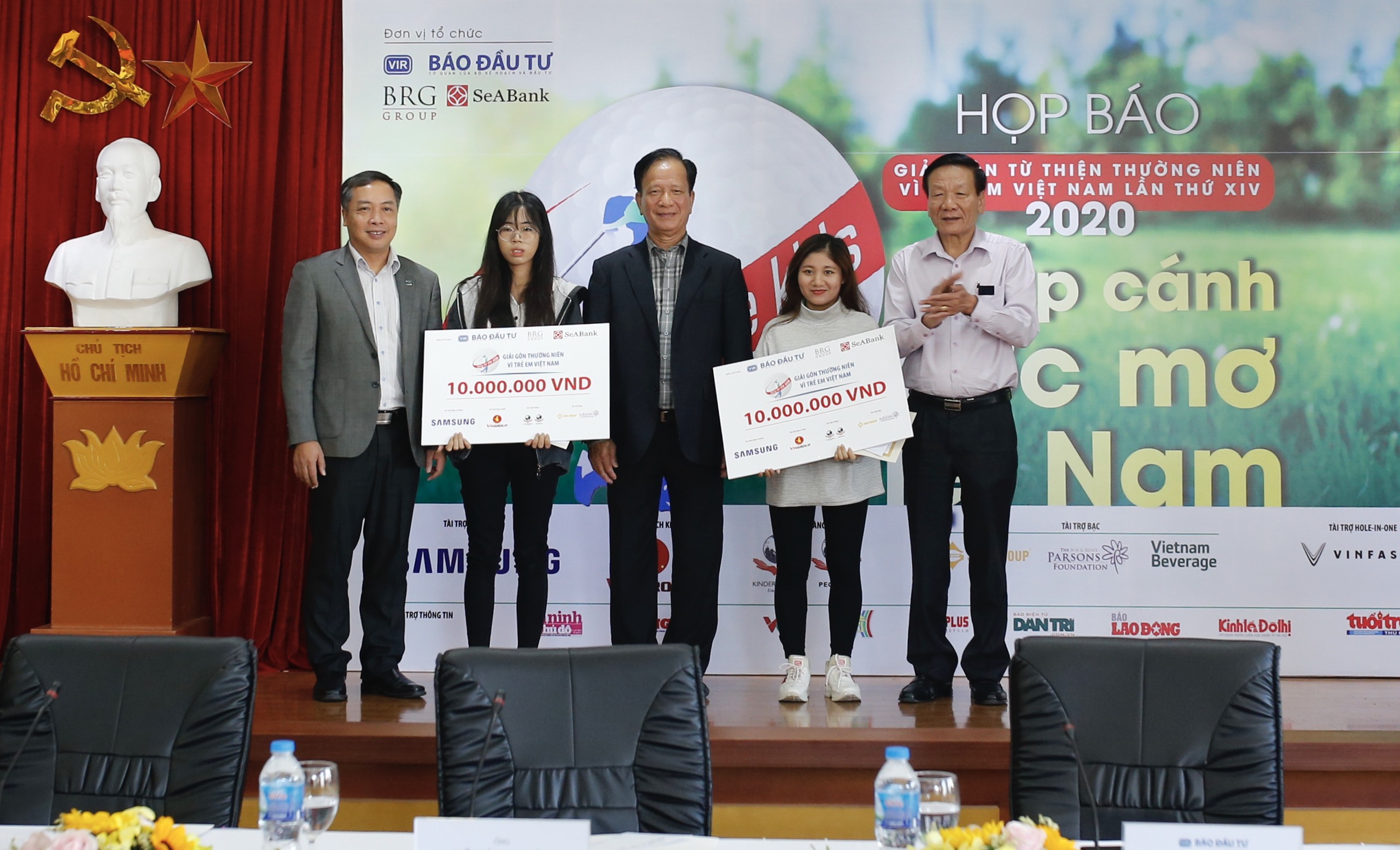 Trong buổi họp báo diễn ra vào sáng 22.10, tại Hà Nội, BTC cũng đã trao 2 suất học bổng toàn phần năm 2020 trị giá 10 triệu đồng/suất và 5 suất học bổng trị giá 6 triệu đồng/suất cho 5 sinh viên có hoàn cảnh khó khăn vươn lên đạt thành tích học tập tốt, tư cách đạo đức tốt.