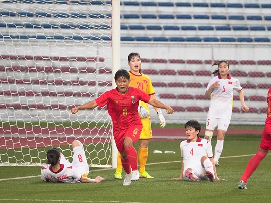 Hàng thủ tuyển nữ Việt Nam chơi mất tập trung và để thủng lưới 2 bàn liên tiếp cuối trận. Ảnh: VFF