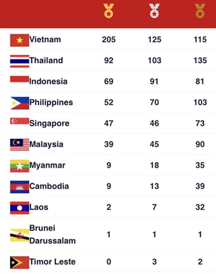 Kết thúc ngày thi đấu cuối cùng, Đoàn Thể thao Việt Nam giành thêm 24 HCV, qua đó giành ngôi nhất toàn đoàn với 205 HCV, 121 HCB và 115 HCĐ, xếp thứ hai là Thái Lan (90 HCV, 103 HCB, 135 HCĐ), Indonesia xếp thứ ba với 69 HCV, 81 HCB, 91 HCĐ.