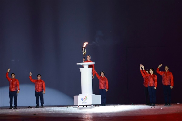 VĐV Quách Thị Lan - nhà vô địch Asian Games 2018 thắp sắng đài đuốc SEA Games 31