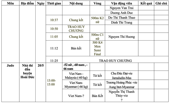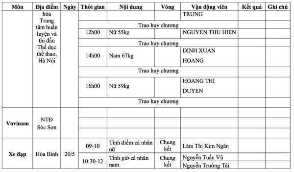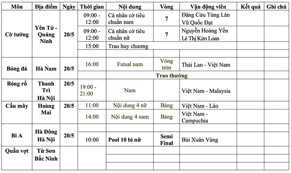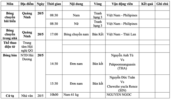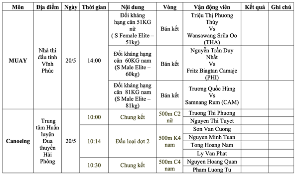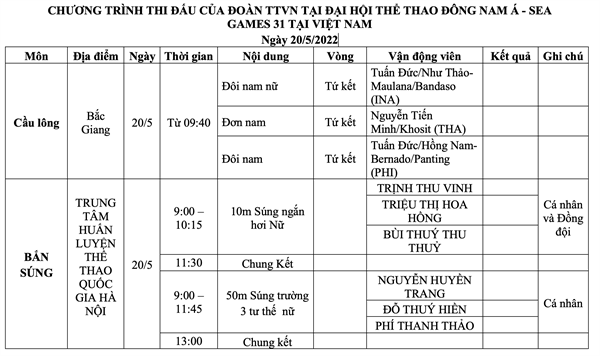 Lịch thi đấu SEA Games 31 ngày 20.5 của Đoàn thể thao Việt Nam