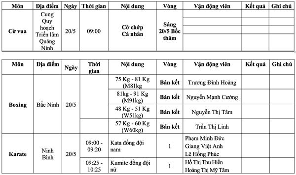 Lịch thi đấu SEA Games 31 ngày 20.5 của Đoàn thể thao Việt Nam: