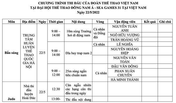 Lịch thi đấu SEA Games 31 ngày 22.5 của Đoàn Thể thao Việt Nam
