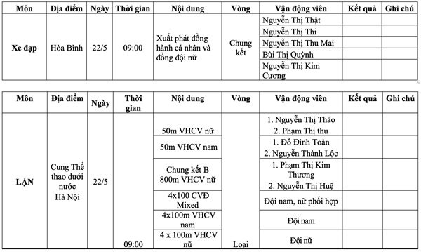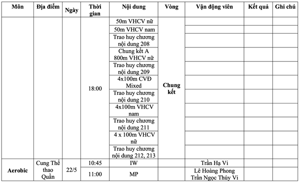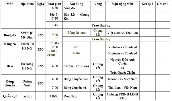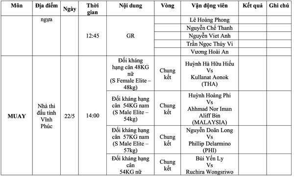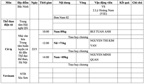 Lịch thi đấu SEA Games 31 ngày 22.5 của Đoàn thể thao Việt Nam: