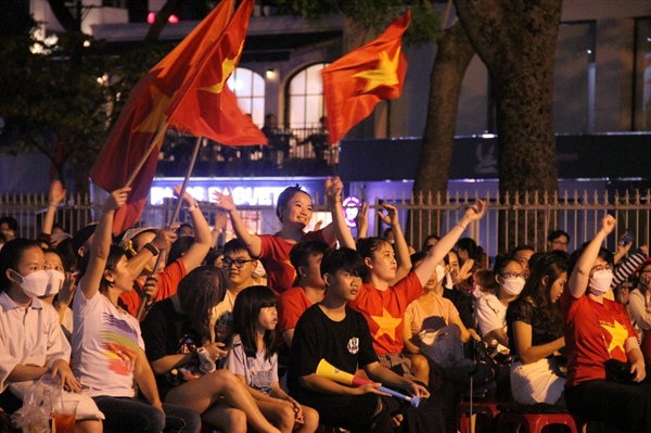 Phố đi bộ Nguyễn Huệ (quận 1, TP.HCM) là nơi tập trung đông nhất người hâm mộ tại TP.HCM đến xem và “tiếp lửa” cho “Những chiến binh sao vàng”
