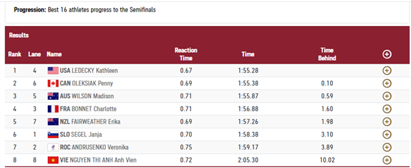 Trước khi bước vào nội dung này, Ánh Viên có thành tích chuẩn B Olympic là 2 phút 0 giây 75, đứng thứ 25/29 VĐV tranh tài ở Olympic Tokyo 2020. Trong tám VĐV thi đấu cùng lượt bơi số 2, thông số của Ánh Viên đứng cuối cùng.