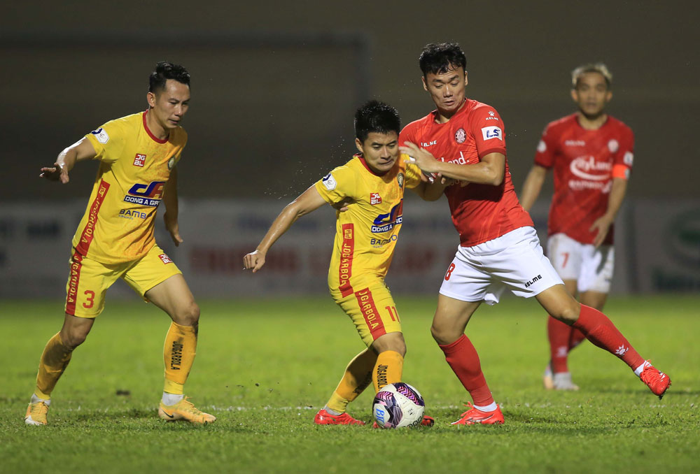 Ba thành viên của CLB TP.HCM (áo đỏ) bị phạt vì phản ứng trọng tài
