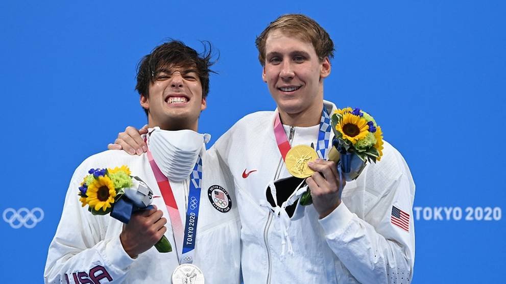 VĐV Jay Litherland (trái) và VĐVChase Kalisz bỏ khẩu trang trên bục nhận huy chương (Ảnh: AFP)