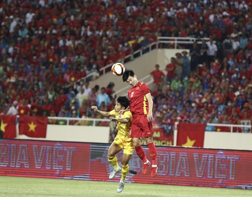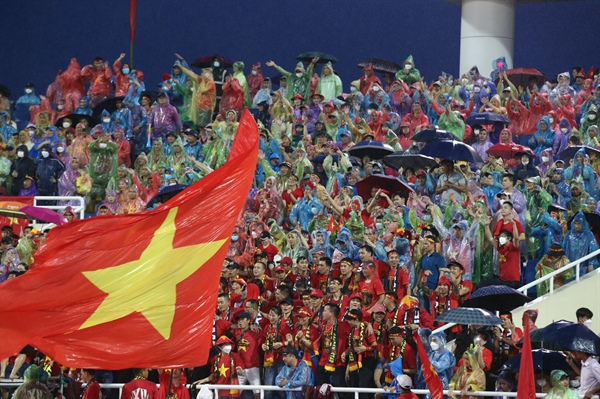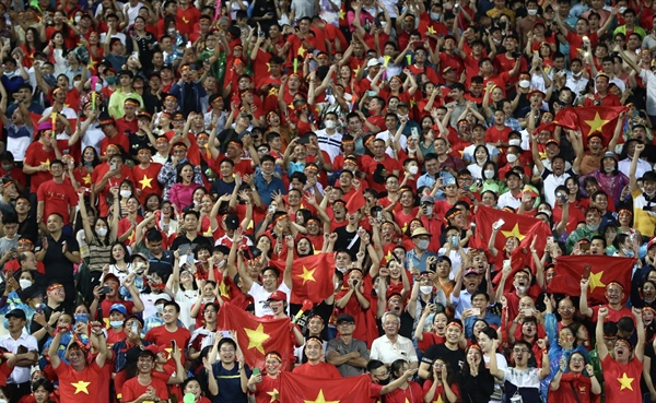 Sân Mỹ Đình không còn chỗ trống, các cổ động viên không ngừng cổ vũ cho đội nhà