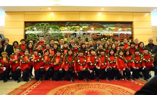 Sau khi xuống máy bay, thầy trò HLV Mai Đức Chung nhận cờ hoa chúc mừng từ lãnh đạo Bộ VHTTDL, Tổng cục TDTT, Liên đoàn bóng đá Việt Nam, đông đảo người hâm mộ và giới truyền thông.