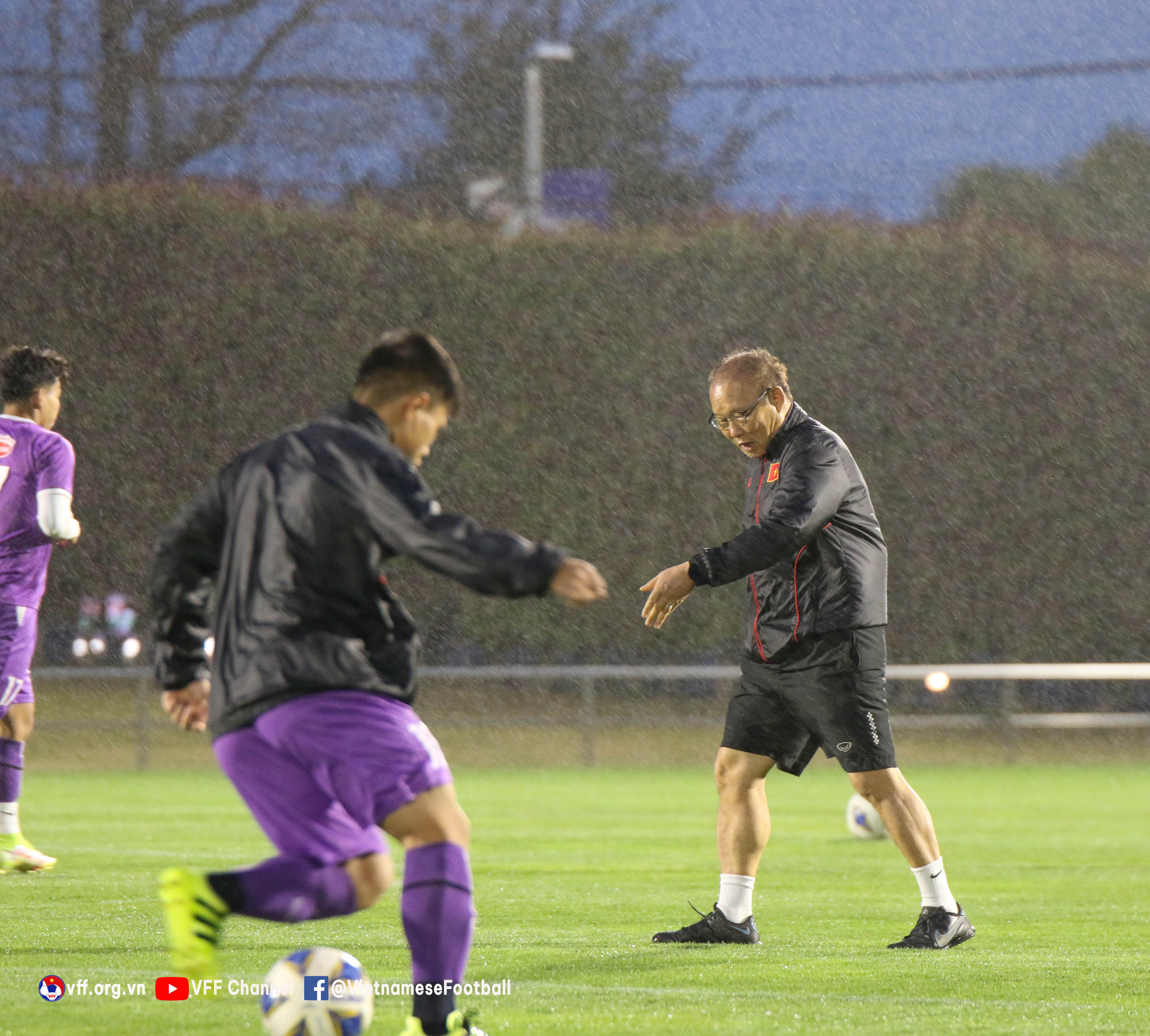 Tuy vậy, buổi tập đầu tiên của đội tuyển đã không được trọn vẹn như mong muốn. Sau nội dung khởi động, trời đổ mưa dày hạt kèm theo nhiệt độ hạ thấp và gió giật rất mạnh, khiến các cầu thủ gặp khá nhiều khó khăn trong việc kiểm soát trái bóng. Lo ngại sức khỏe các học trò có thể bị ảnh hưởng trong điều kiện thời tiết bất lợi như vậy, HLV Park Hang-seo quyết định nổi còi thu quân khi buổi tập mới trôi qua chưa đến 50 phút.