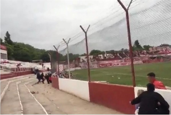 Cầu thủ 2 đội cùng cổ động viên núp sau các bức tường để tránh đạn lạc trong trận cầu tại Argentina (Ảnh: Los Andes)