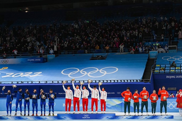 Các VĐV Trung Quốc nhận HCV môn trượt băng tốc độ tiếp sức hỗn hợp 2.000m (Ảnh: NY Times)