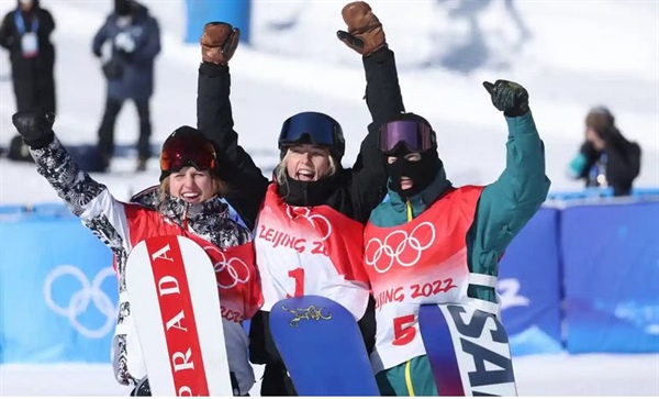 VĐV Zoi Sadowski Synnott (giữa) của New Zealand giành HCV nội dung trượt ván trên tuyết tại Olympic Bắc Kinh 2022 (Ảnh: Reuters)