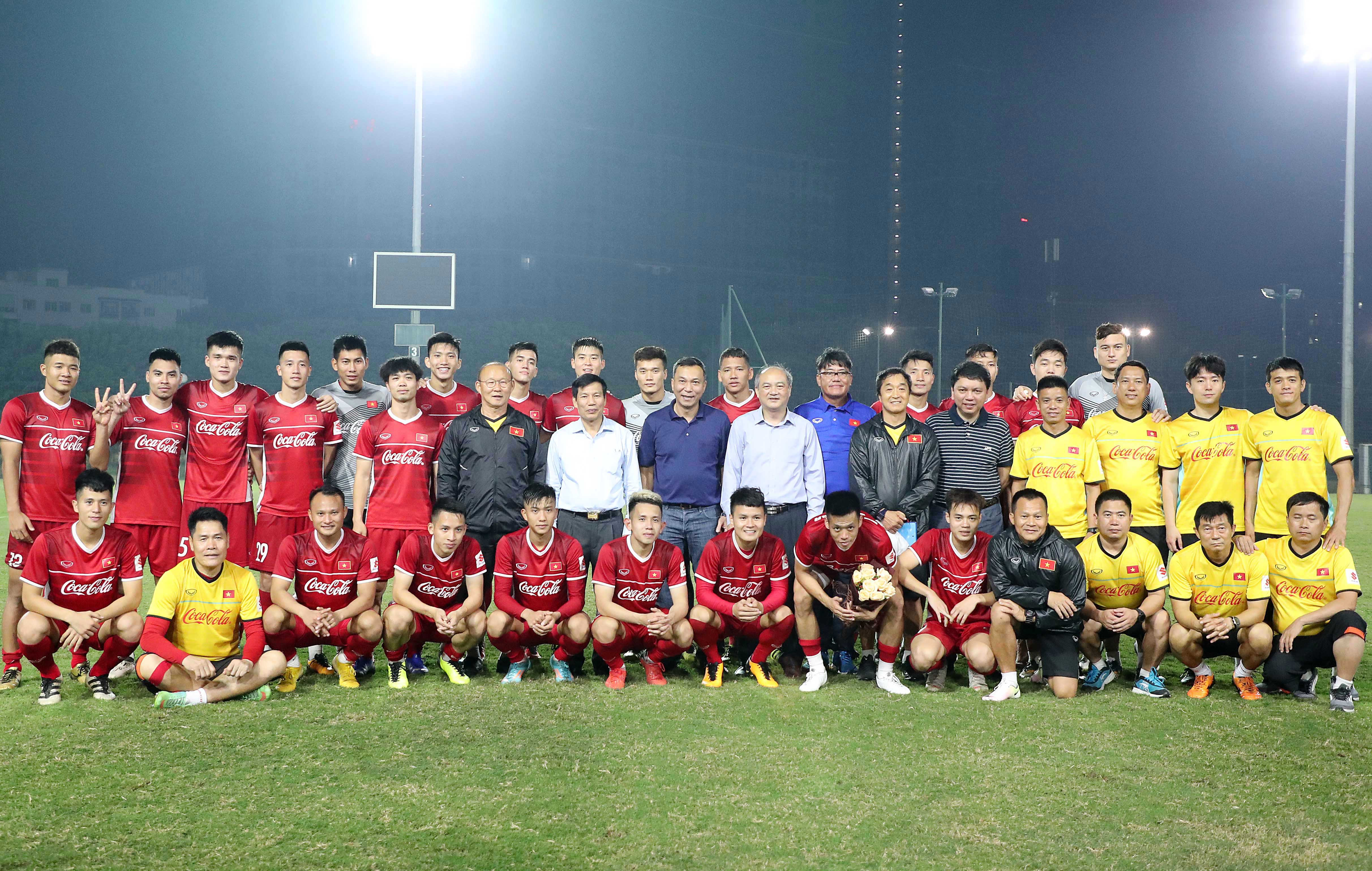Bộ trưởng chụp ảnh với Đội tuyển Việt Nam dự AFF Cup 2018