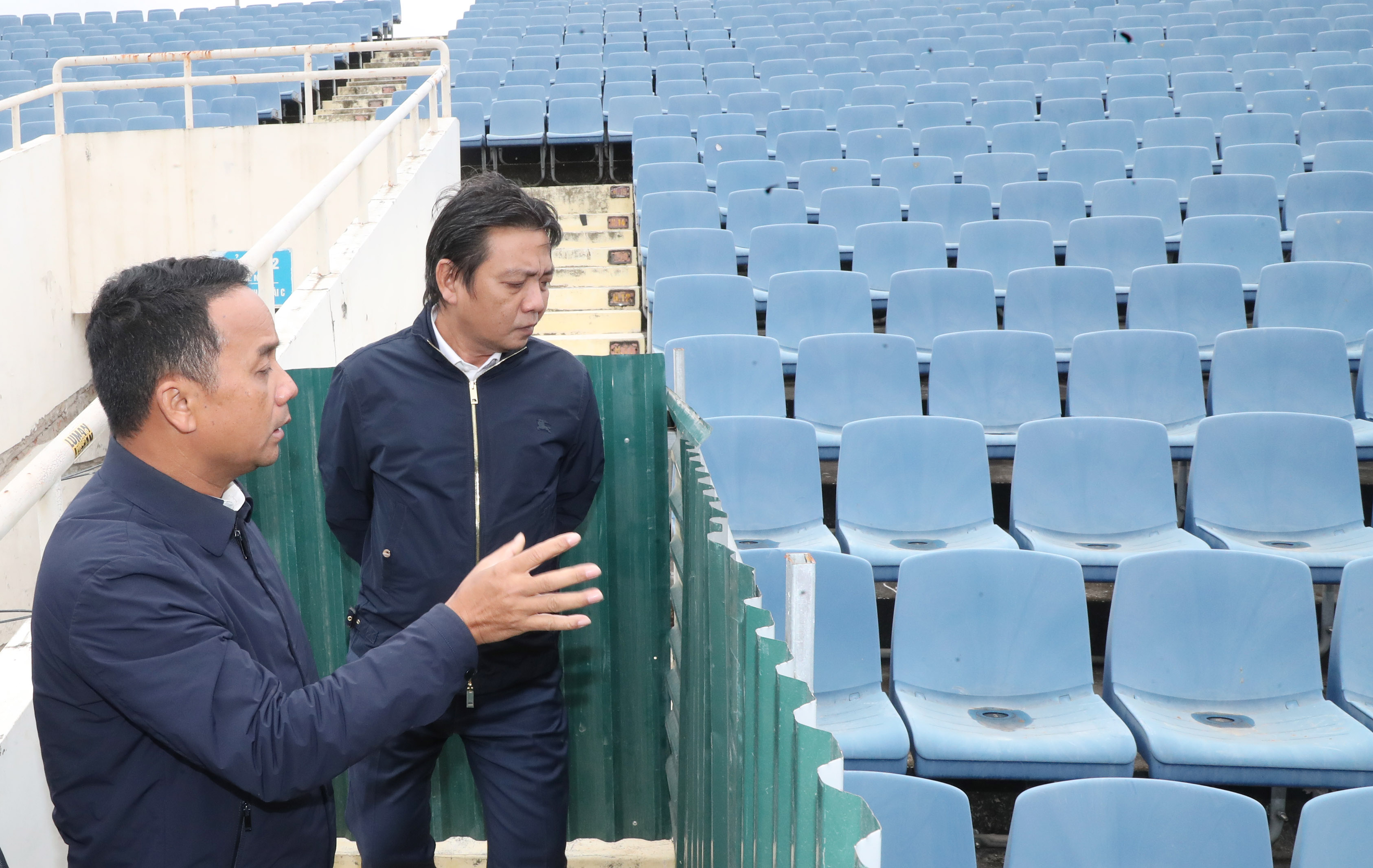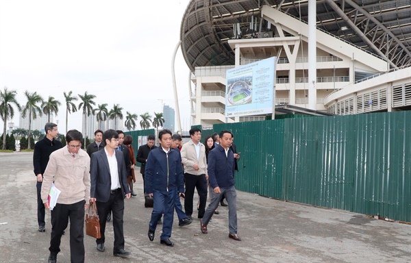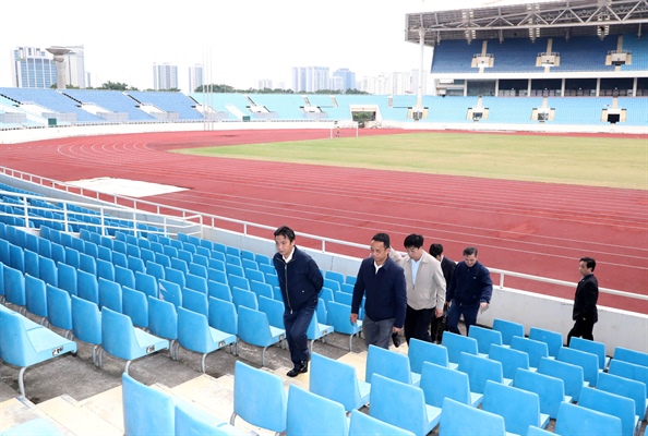 Thứ trưởng kiểm tra khán đài sân Mỹ Đình. Ảnh: Trần Huấn