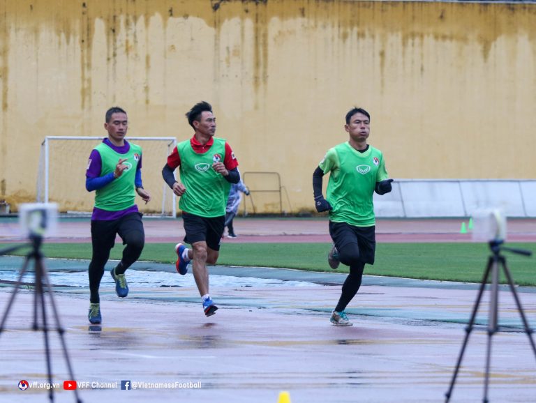 Trọng tài V.League kiểm tra bài thể lực trong thời tiết mưa lạnh