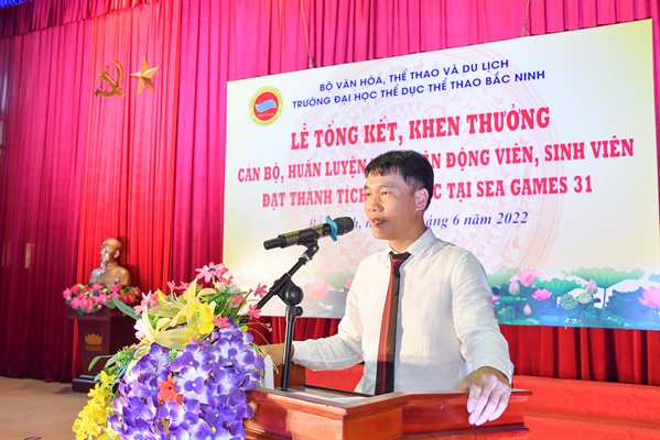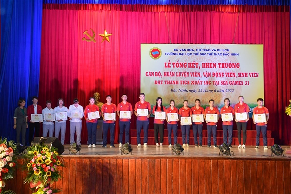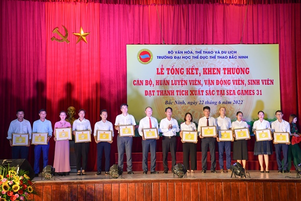 Tại Lễ trao thưởng, Trường Đại học TDTT Bắc Ninh đã tặng Giấy khen của nhà trường cho 3 tập thể và 30 là cá nhân cán bộ, HLV của nhà trường và 184 VĐV có thành tích xuất sắc tại SEA Games 31.