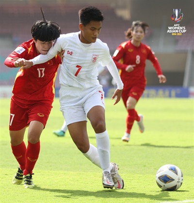 Tuyển nữ Việt Nam (áo đỏ) hoàn thành mục tiêu đầu tiên vượt qua vòng bảng. Ảnh: AFC