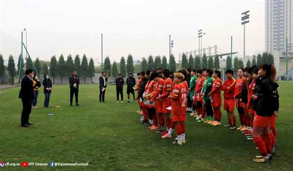 Lãnh đạo VFF động viên tuyển nữ Việt Nam trước ngày lên sang Tây Ban Nha tập huấn. Ảnh: VFF