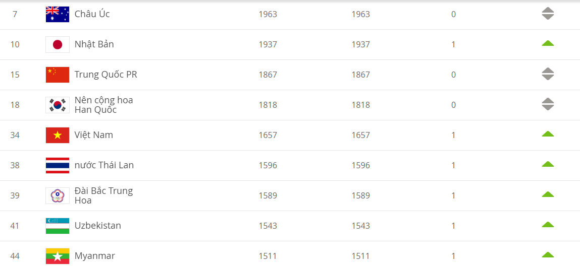 Các cô gái tuyển Việt Nam dù không thi đấu bất cứ trận nào trong quý IV năm 2020 nhưng vẫn tăng 1 bậc với 1657 điểm để xếp hạng 34 thế giới, hạng 5 châu Á và số 1 Đông Nam Á.