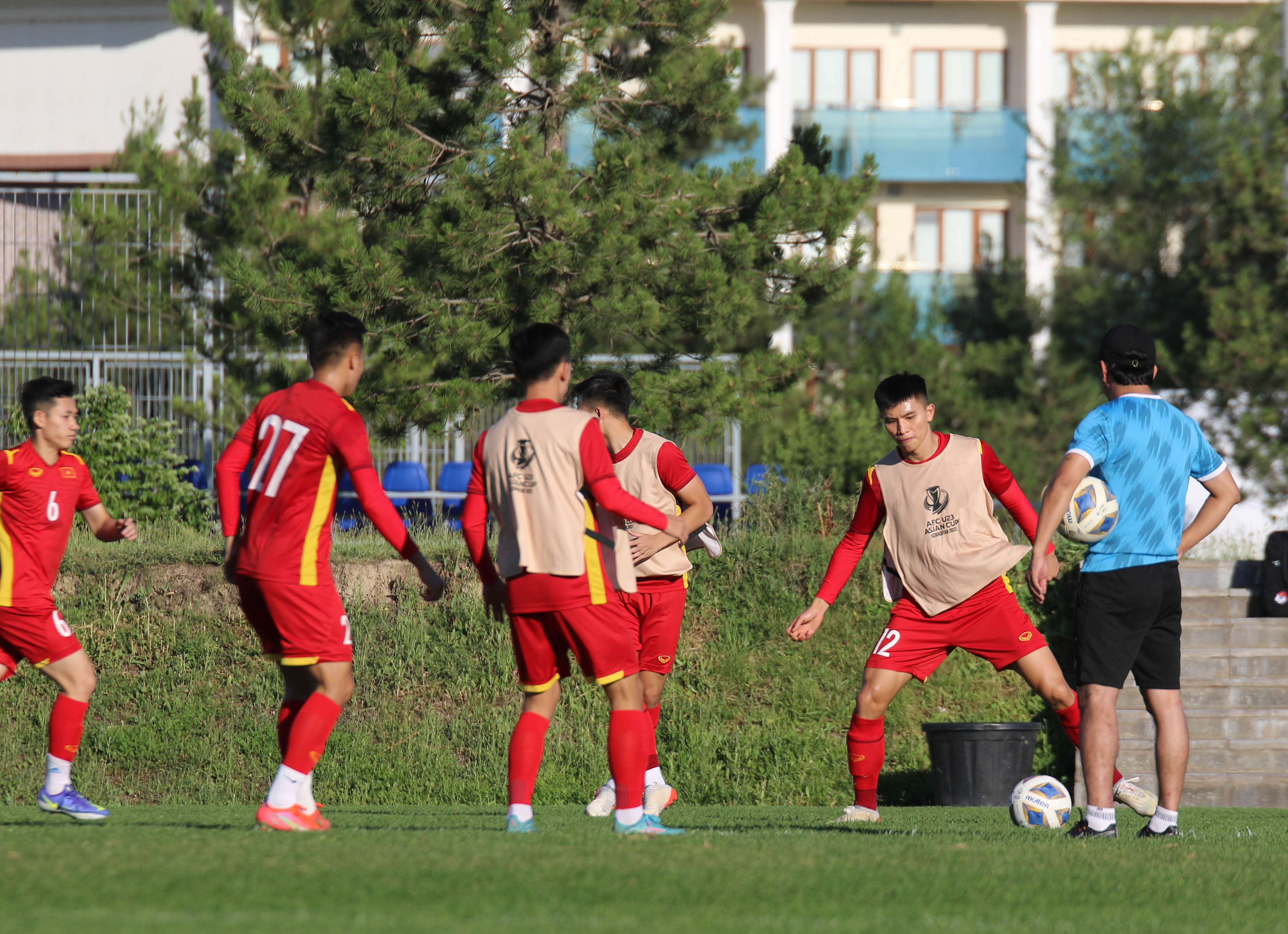 Trước đối thủ mạnh nhất bảng, các cầu thủ U23 Việt Nam tiếp tục duy trì nguồn năng lượng tích cực với bầu không khí tập luyện hứng khởi trên sân tập và tinh thần lạc quan hướng tới kết quả tốt nhất.