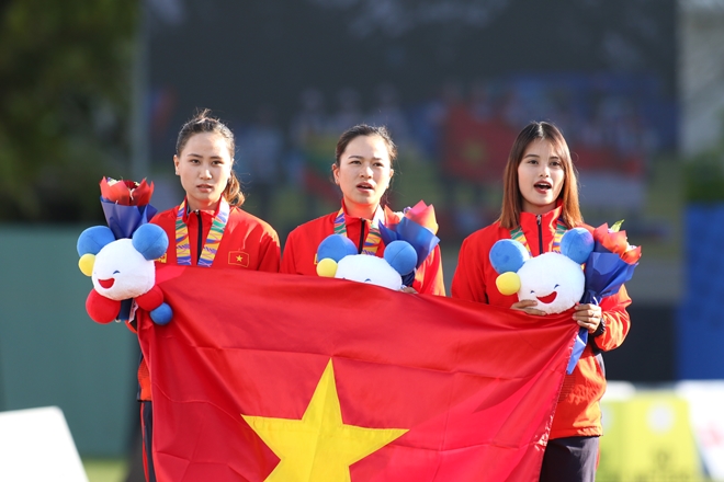 Cô gái người Tày - Lộc Thị Đào (giữa) và nữ cung thủ người Mường Nguyễn Thị Phương (bìa trái) từng giành nhiều thành tích cao cho bắn cung Việt Nam