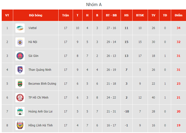Với những kết quả này, thứ hạng của 4 đội dẫn đầu sau lượt thứ 4 nhóm A vẫn không thay đổi. Viettel vẫn vững vàng ngôi đầu với 34 điểm, CLB Hà Nội xếp thứ hai với 2 điểm ít hơn, CLB Sài Gòn và Than Quảng Ninh lần lượt xếp sau khi cùng được 31 điểm. Cuộc đua đến chức vô địch sẽ rất hấp dẫn ở 3 vòng cuối khi 4 đội này sẽ đối đầu trực tiếp với nhau.