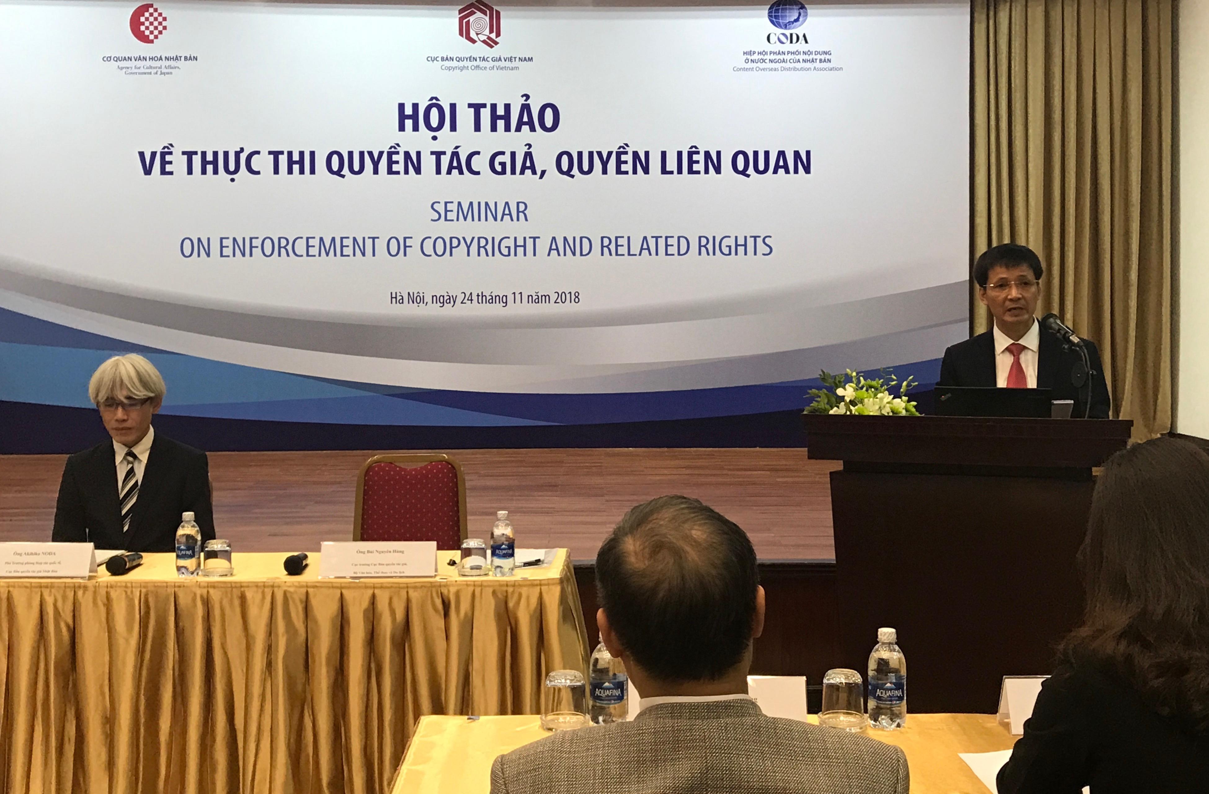 “Hội thảo về thực thi quyền tác giả, quyền liên quan do hai Cục Bản quyền tác giả của hai nước Việt Nam, Nhật Bản phối hợp tổ chức diễn ra vào thời điểm chúng ta vừa chứng kiến những sự kiện quan trọng trong lĩnh vực bản quyền tác giả. Đó là việc UB Châu Âu trình Hiệp định Thương mại tự do VN- EU FTA lên Nghị viện Châu Âu để các nước thành viên EU xem xét, phê chuẩn. Kỳ họp Quốc hội Việt Nam vừa qua cũng đã xem xét, biểu quyết thông qua Nghị quyết phê chuẩn Hiệp định đối tác toàn diện và tiến bộ xuyên Thái Bình Dương (CP.TPP) gồm 11 nước, trong đó có Việt Nam.
