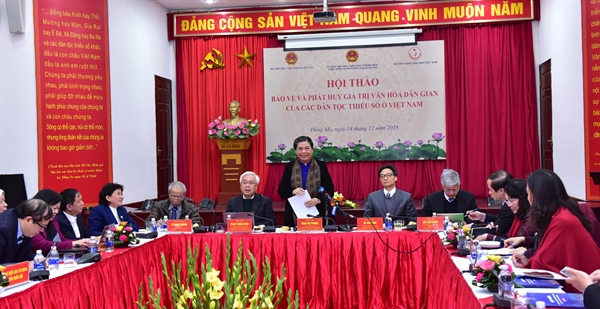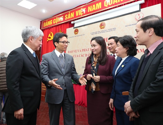 Lắng nghe ý kiến của các chuyên gia, nhà nghiên cứu, Phó Thủ tướng Vũ Đức Đam ghi nhận những tâm huyết, nỗ lực trong công tác bảo tồn di sản văn hóa dân gian các DTTS. Phó Thủ tướng nhấn mạnh, cần kiên trì thực hiện theo lộ trình, đồng thời, cần sự chung tay của cả Nhà nước và cộng đồng, trong đó Nhà nước có vai trò quan trọng trong việc tạo ra môi trường, mối liên kết giữa các bên. Bên cạnh đó, cần có các chính sách cho nghệ nhân, đặc biệt là các nghệ nhân già.