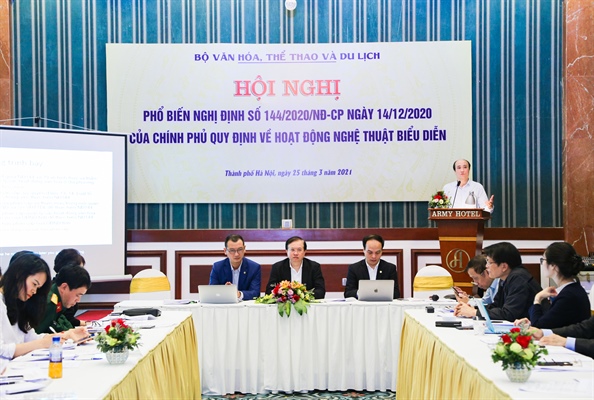 Phát biểu tại Hội nghị, Thứ trưởng Bộ VHTTDL Tạ Quang Đông cho biết, thực hiện Chương trình công tác của Chính phủ, Thủ tướng Chính phủ, trong thời gian qua, Bộ VHTTDL được giao chủ trì, phối hợp với các cơ quan hữu quan xây dựng dự thảo Nghị định quy định về hoạt động nghệ thuật biểu diễn để trình Chính phủ xem xét, ban hành. Ngày 14.12.2020, Chính phủ đã ban hành Nghị định số 144 về hoạt động nghệ thuật biểu diễn, có hiệu lực thi hành từ ngày 1.2.2021, thay thế cho Nghị định số 79 ngày 5.10.2012 và Nghị số 15 ngày 15.3.2016 trước đó. Hội nghị sẽ cung cấp và trang bị những nội dung cốt lõi của Nghị định số 144, những quy định mới so với các Nghị định trước nhằm bảo đảm sự thống nhất trong công tác quản lý nhà nước; tạo thuận lợi cho các cơ quan, tổ chức, cá nhân thực hiện trong thời gian tới.