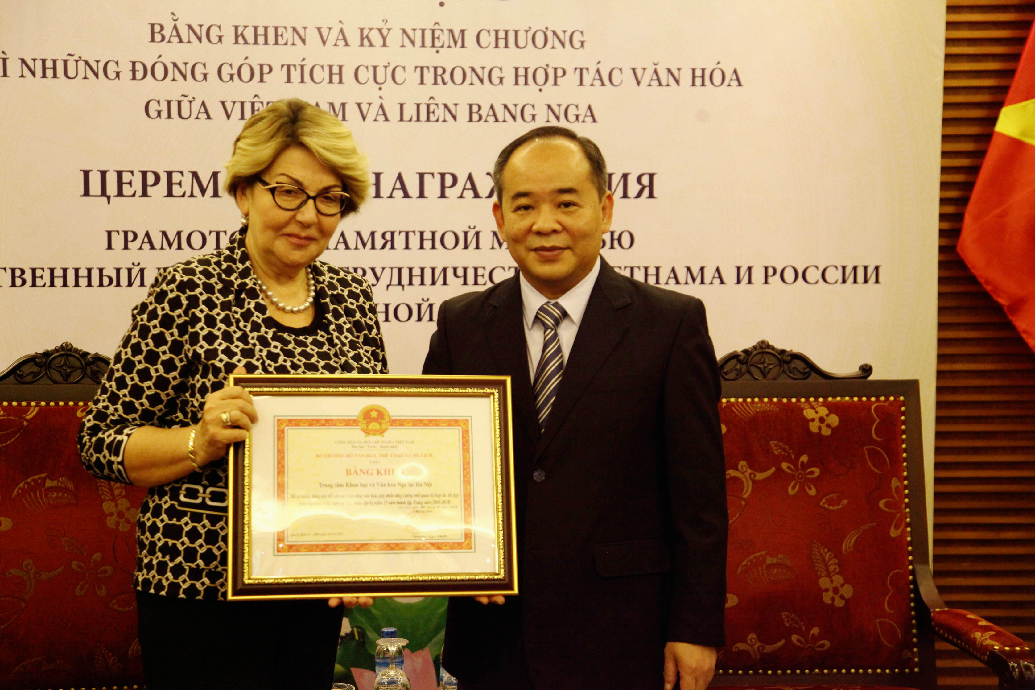 Nhân dịp kỷ niệm 15 năm thành lập và nhằm mục đích ghi nhận những đóng góp của Trung tâm Khoa học và Văn hóa Nga tại Hà Nội đối với hợp tác văn hóa Việt Nam – Liên bang Nga, Bộ trưởng Bộ VHTTDL quyết định có hình thức khen thưởng đối với tập thể và cá nhân thuộc Trung tâm gồm Bằng khen của Bộ trưởng Bộ VHTTDL cho Trung tâm KHVH Nga tại Hà Nội vì những thành tích trong hợp tác giao lưu văn hóa, Việt Nam – Nga, góp phần phát triển quan hệ hợp tác đối tác chiến lược toàn diện Việt Nam- Nga và Kỷ niệm chương vì sự nghiệp văn hóa, thể thao và du lịch cho bà Shaffinskaya Natalia, giám đốc Trung tâm KHVH Nga tại Hà Nội.