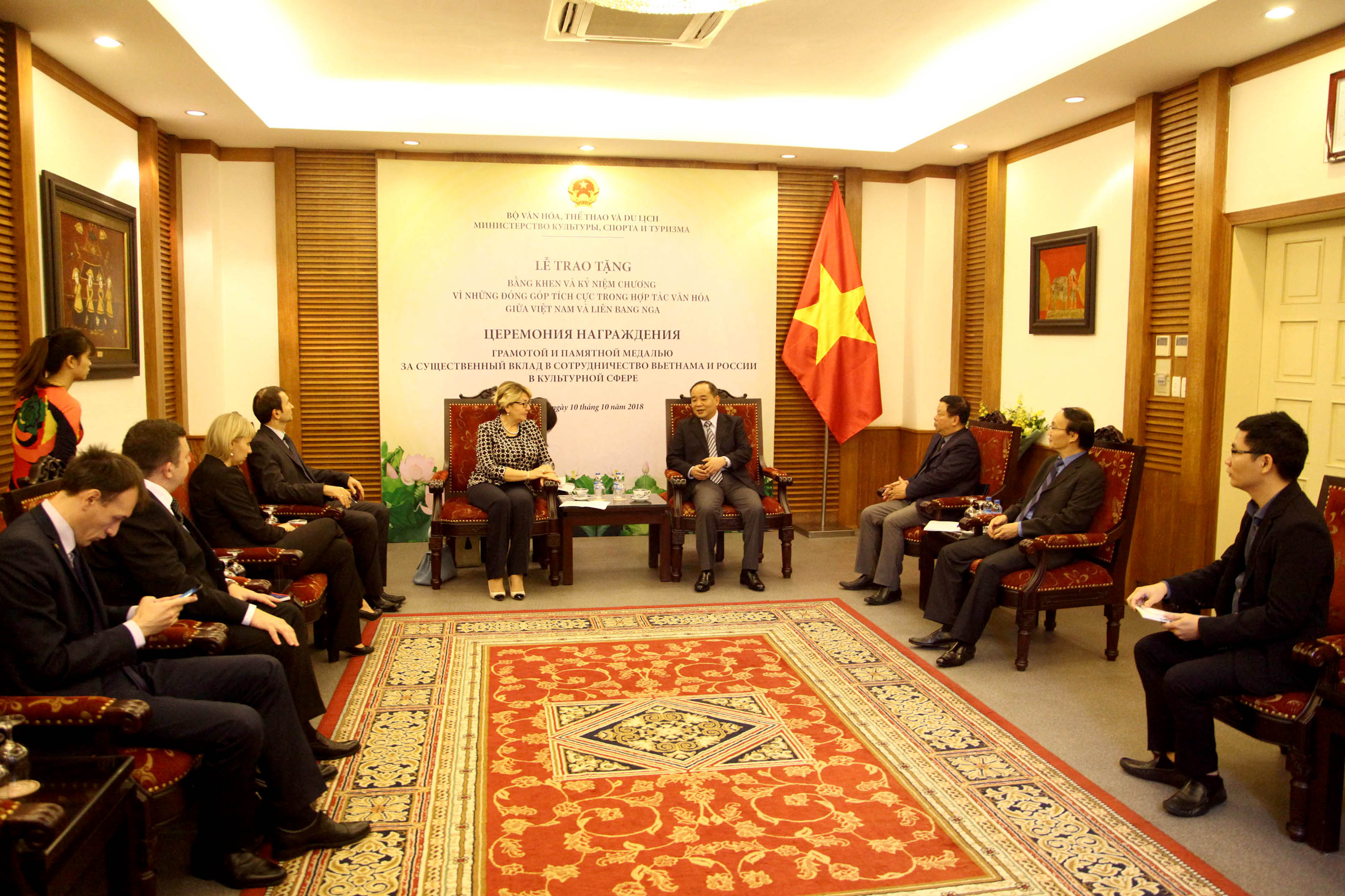 Sáng 10.10, tại Hà Nội, Thứ trưởng Bộ VHTTDL Lê Khánh Hải đã tiếp và trao Bằng khen, Kỷ niệm chương cho Giám đốc Trung tâm Khoa học và Văn hóa Nga tại Hà Nội.