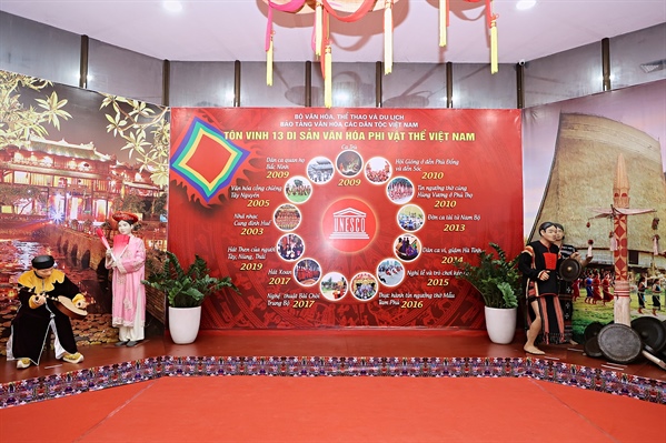 Triển lãm diễn ra với nhiều hoạt động và nội dung phong phú. Khu trưng bày chủ đề “Di sản văn hóa phi vật thể Việt Nam” do Trung tâm Triển lãm VHNT Việt Nam và Bảo tàng các dân tộc Việt Nam thực hiện, trưng bày hình ảnh, trang phục, nhạc cụ truyền thống, hiện vật, tư liệu về các di sản văn hóa phi vật thể Việt Nam được Unesco ghi danh và di sản văn hóa phi vật thể, lễ hội truyền thống của Việt Nam.