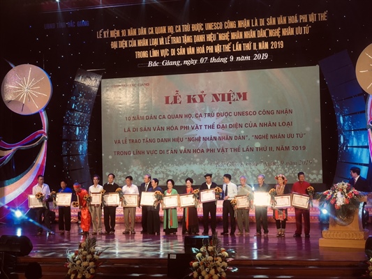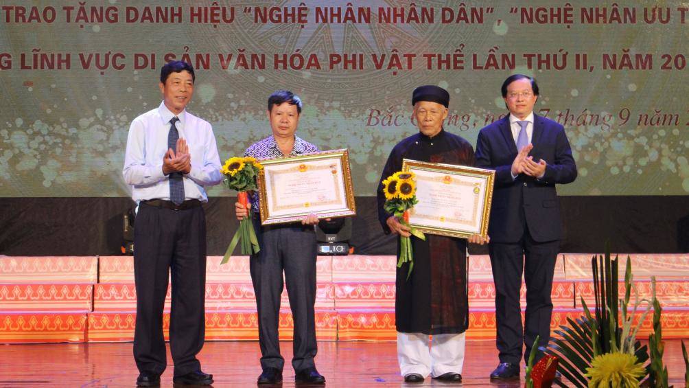 Tại buổi lễ, thừa ủy quyền của Chủ tịch nước, Bí thư Tỉnh ủy, Chủ tịch HĐND tỉnh Bắc Giang Bùi Văn Hải; Thứ trưởng Bộ VHTTDL Tạ Quang Đông trao danh hiệu NNND cho hai nghệ nhân Hoắc Công Chờ (huyện Việt Yên, nghệ thuật trình diễn dân gian - quan họ) và Nguyễn Bá Lam (huyện Việt Yên, nghệ thuật trình diễn dân gian - tuồng cổ).