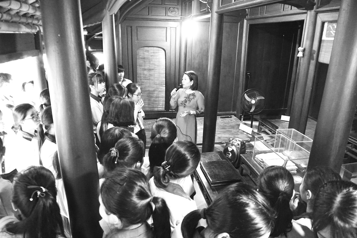 Học sinh tham quan, tìm hiểu di tích Nhà lưu niệm Bác Hồ tại làng Dương Nỗ