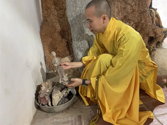 Sư thầy Thích Thánh Nghĩa cho biết, những bộ phận gãy rụng của tượng Quan âm tống tử được những người trông coi chùa phải xếp tạm vào một góc chờ tu bổ