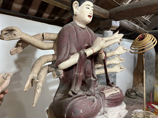 Sư thầy Thích Thánh Nghĩa cho biết, những bộ phận gãy rụng của tượng Quan âm tống tử được những người trông coi chùa phải xếp tạm vào một góc chờ tu bổ