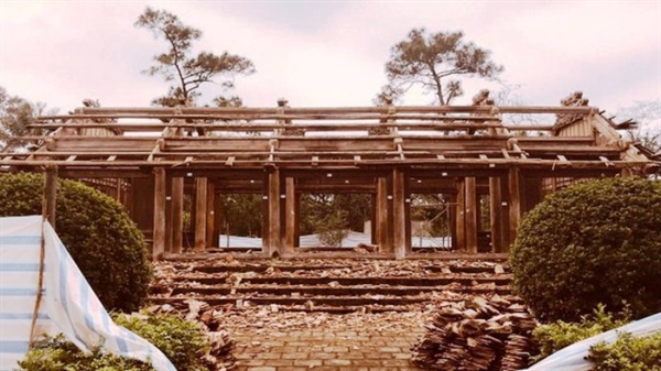 Hiện di tích đình Chợ Trổ đang được hạ giải để tiến hành tu bổ Ảnh: THÂN BA